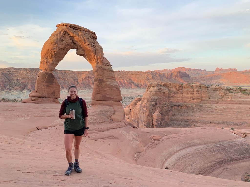 I love to start my day really early with Delicate Arch Trail (3.2 miles) for sunrise. This trail gets extremely busy so I do recommend going early or late in the day. Sunrise here is so beautiful and absolutely worth the early rise. To get to delicate arch by sunrise that means you’re typically starting the hike in the dark (it’s 1.6 miles to Delicate Arch one way) so having a headlamp on hand is always a good idea. I like to pack my breakfast and eat it while watching sunrise.