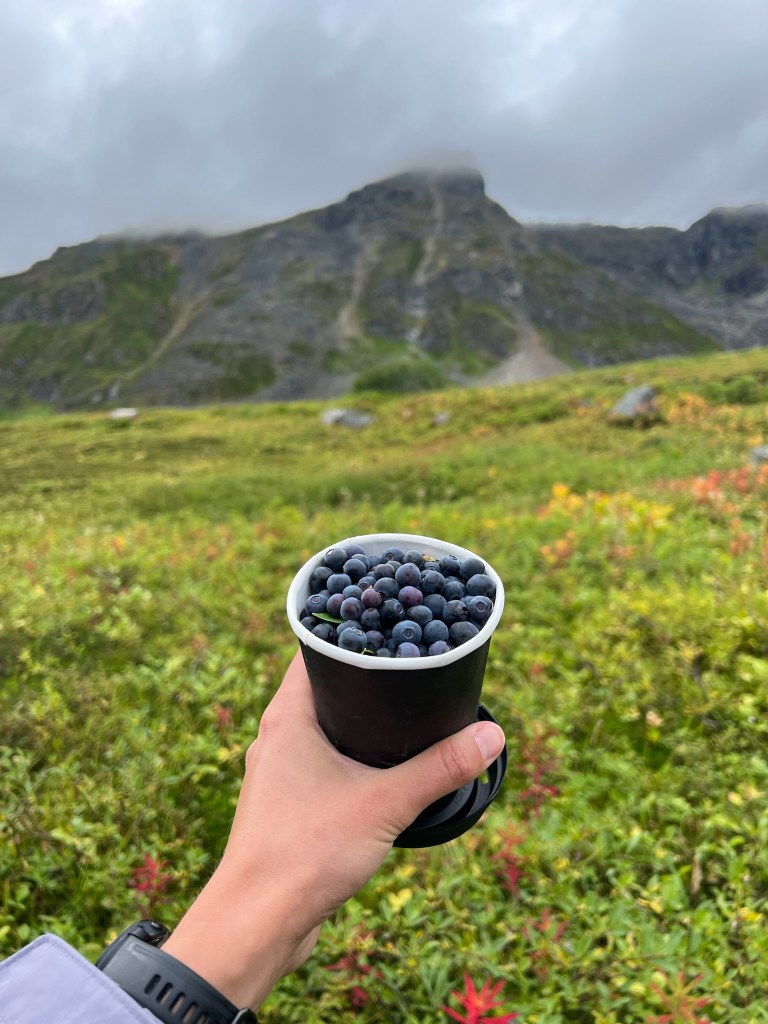 End of August through September is wild berry season in Alaska! There were wild blueberries all over Hatcher’s Pass during my most recent trip that I picked after I hiked. They are small and delicious so if you’re in Alaska in September, look for wild blueberries on and around the trails. They turn sweet after the first frost!