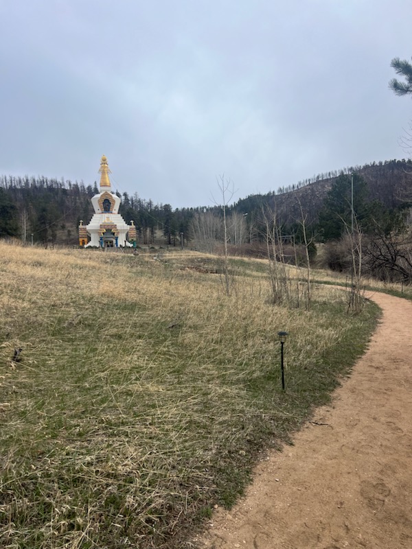 I hiked down from the Great Stupa and journaled at breakfast (the food was very good!). Then I headed to my first meditation session. I typically do not sit on a meditation pillow in lotus when I meditate so it was an adjustment for my back and my body to get used to sitting in that posture. By the end of the weekend, I was a bit achy. We alternated between 25 minute silent sitting meditations typically done with your eyes open and 10 minute intentional walking meditations. We went through the sitting / walking meditation cycle for 3 hours before we broke for lunch. After lunch we had rest time before our next 3 hour meditation session where I hiked around the property and up to the Great Stupa. After dinner at the end of the first day, Loden gave a talk on the stages of meditation and what we could be experiencing. Some attendees opted to briefly share what they experienced that day but I decided to stay silent.