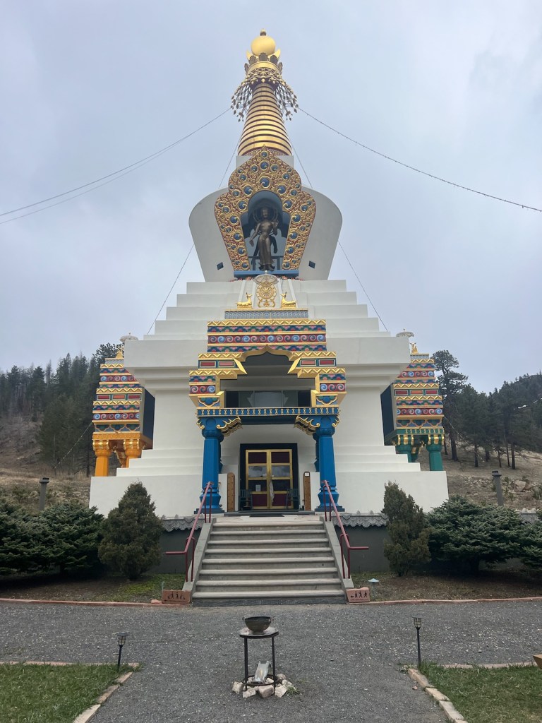 The retreat was led by a Buddhist Monk at a retreat center in the mountains in Colorado off a long dirt road with no cell service or nearby neighbors. The setting was peaceful with hiking trails around the property and a beautiful Great Stupa which is a Buddhist shrine / monument used for meditation. There were separate buildings for sleeping, eating, and meditating and typically there is more than one retreat going on at a time.