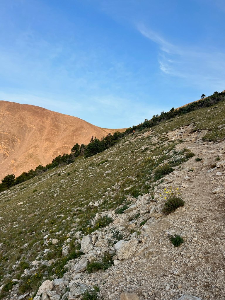 There is a junction 0.1 miles up the trail where you will turn right onto the Colorado Trail. About .3 miles later the trail splits again where you stay left to Mt. Shavano trail. If you continue straight you will stay on the Colorado Trail heading north towards Denver. The first turn is obvious but the second is easy to miss in the dark. We missed it and after crossing a river we looked at the map and turned around. If you cross a river before turning left on to Mt. Shavano Trail, you’ve gone a bit too far! Once we got back on track, it was a steady incline to the top. The trail is 9.5 miles total with about 4,500 ft. elevation gain averaging to 1000 ft. gain per mile on the way up. To put this in perspective, hiking to the bottom of the Grand Canyon and back up is approximately 5000 ft. of elevation decline and gain so 4500 ft. gain at high altitudes is not for the faint of heart but it is very doable if you keep putting one foot in front of the other.