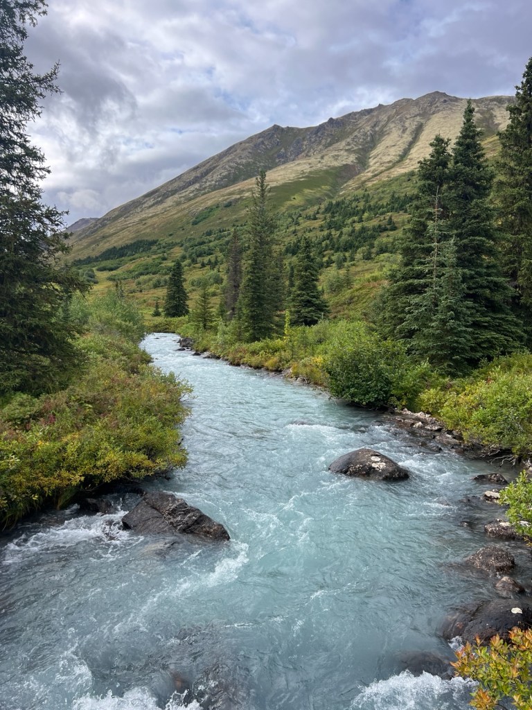 I had been wanting to hike South Fork Valley Trail (10.8 miles, 1,535 ft gain) which takes you to Eagle and Symphony Lake. It’s located in the Chugach Mountain Range which is home to quite a few grizzlies and black bear. I had been nervous to do this trail alone as it does not take you up and out of the bush for the entirety of the hike. The South Fork is a long, meandering trail through a valley, along a river, and eventually over boulder fields to get to two lakes. Practicing safety in numbers (and bringing bear spray), my hiking friend and I set out to do this trail on a Monday morning. We kept our head on a swivel and caught up on all things life until we got to the turquoise blue lakes. The trail was gorgeous. We were the only ones at the lakes when we arrived so we enjoyed the views and a snack before we headed back. These lakes are also a great place to fish for grayling if you pack your fishing pole and it is open fishing season. I recommend adding this to your list of trail to-dos if you have time in Alaska.