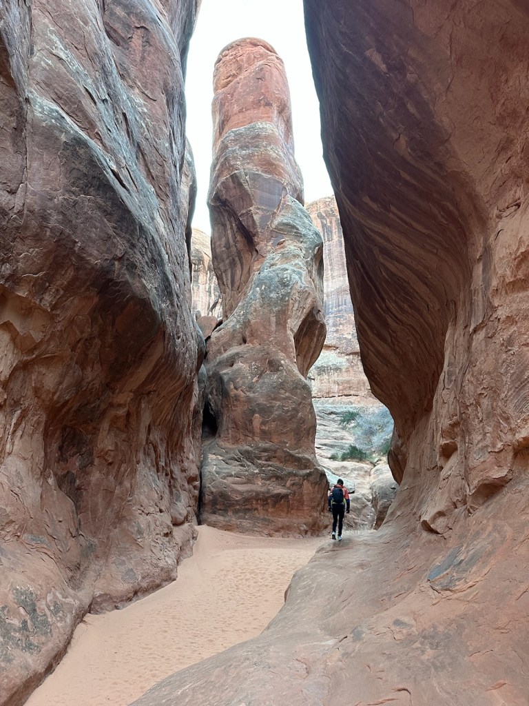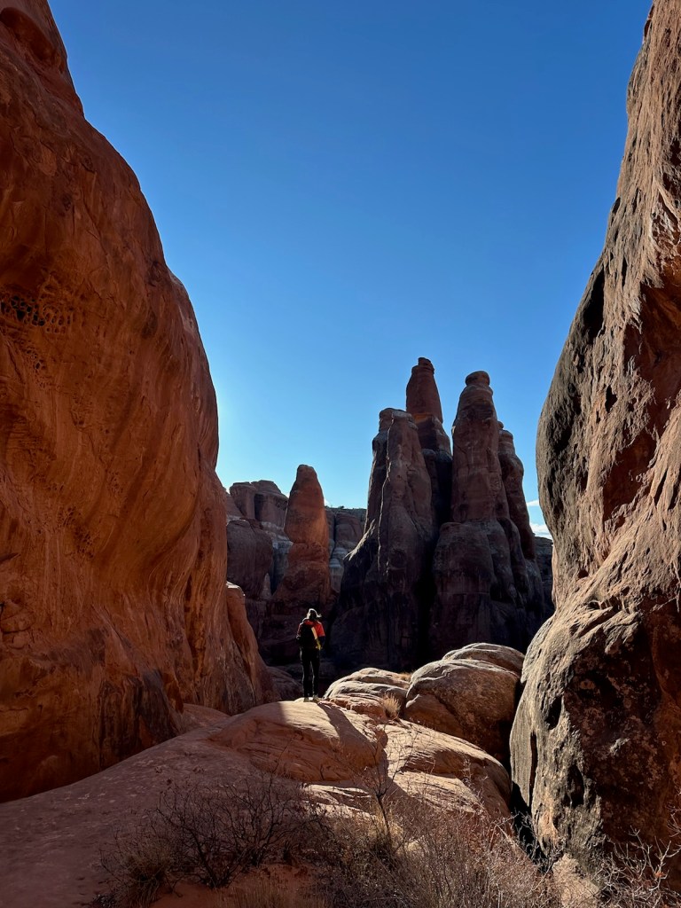 I had been wanting to hike a permitted trail in Arches National Park called Fiery Furnace and it is much easier to get a permit for it in the off season (November- March). Permits open to be reserved online two days in advance of the intended hiking date. When picking the permit up at the visitors center you’ll talk with a ranger and watch an eight minute video on protecting and being a good steward of the area during your time on and off this trail.