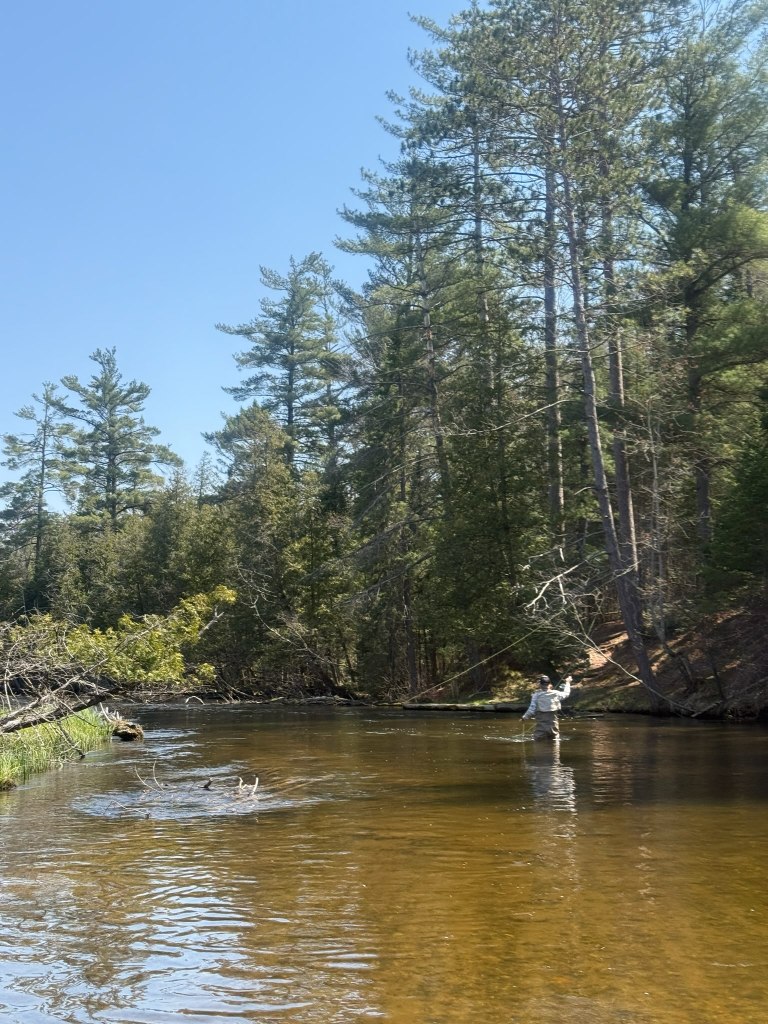 As I waded down river, I saw my dream A-Frame home on the left side of the river set back and shaded by trees. I was day dreaming of what it’d be like to own this home on the Au Sable and doing my final casts when I saw the sun reflect off scales around my fly. I cast again and landed a beautiful, small rainbow trout. I couldn’t believe it. I was over the moon with excitement, unhooked him, set him free, and ran back to tell every person at the lodge about my perfect (blue ribbon to me!) fish. I couldn’t have asked for a better way to end our fishing trip on the Au Sable.