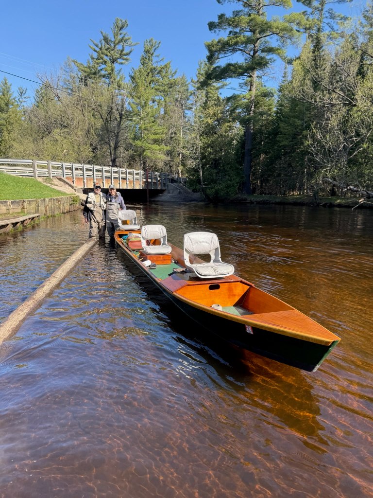 On Sunday after breakfast, my dad and I went on a 8-hour guided fishing trip in an Au Sable River boat down the South Branch. The Au Sable River boat is a wooden, long and narrow, flat-bottomed boat that was designed specifically for navigating the Au Sable. We fished the Mason Tract which is a protected section of the river with no developments allowing for miles of wild, winding river. The sun was shining and we caught so many beautiful small trout. We saw only one other person over the 8 hours. The day was a hoot complete with my dad taking a spill, flooding his waders and having to dry off on the river bank.
